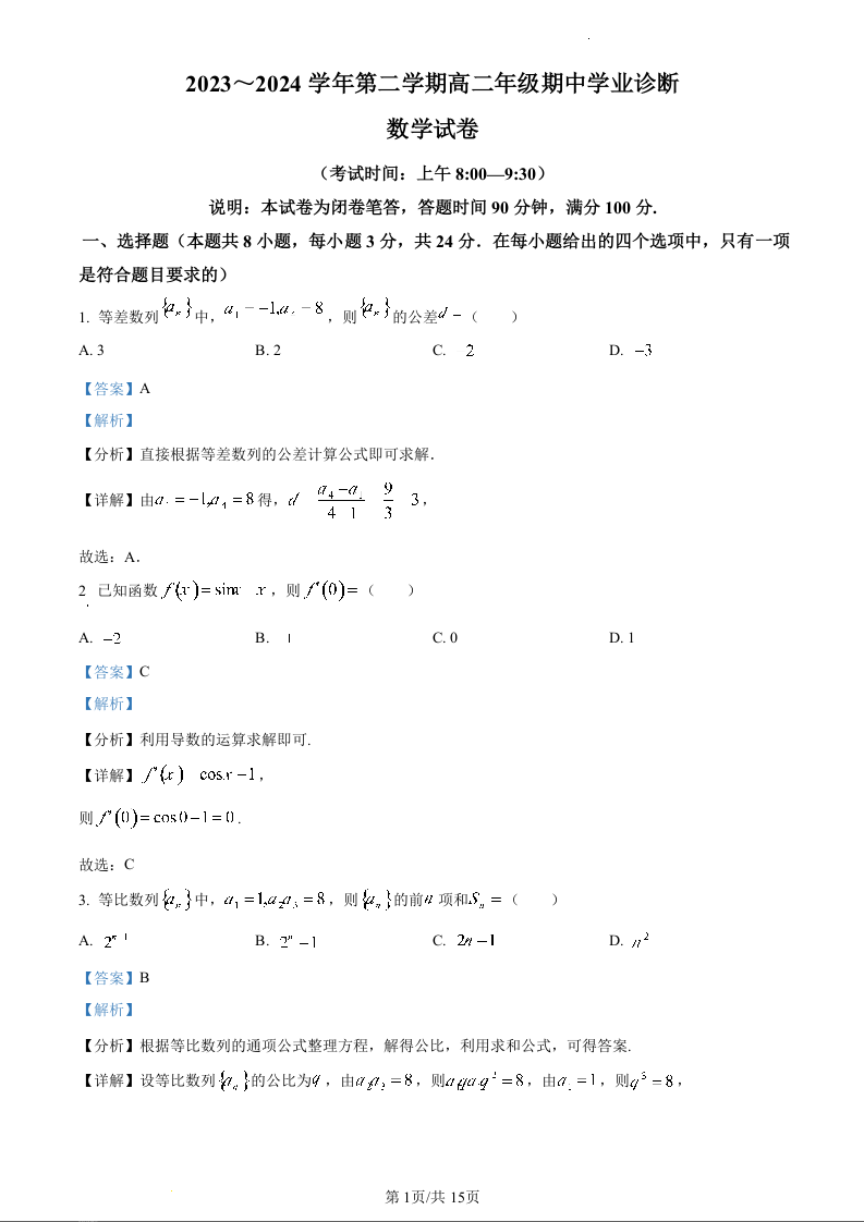 山西省太原市2023-2024学年高二下学期4月期中考试数学(精品解析版)