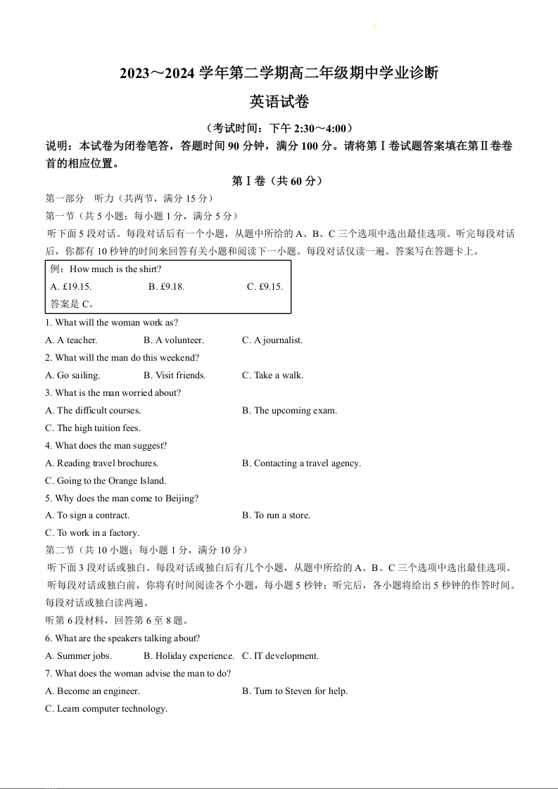 山西省太原市2023-2024学年高二下学期4月期中考试英语+答案