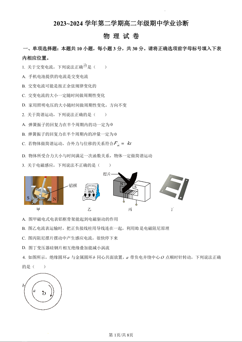 山西省太原市2023-2024学年高二下学期4月期中考试物理(原卷版)