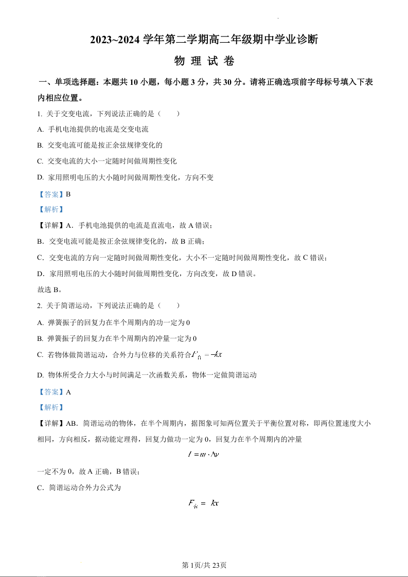 山西省太原市2023-2024学年高二下学期4月期中考试物理(精品解析版)
