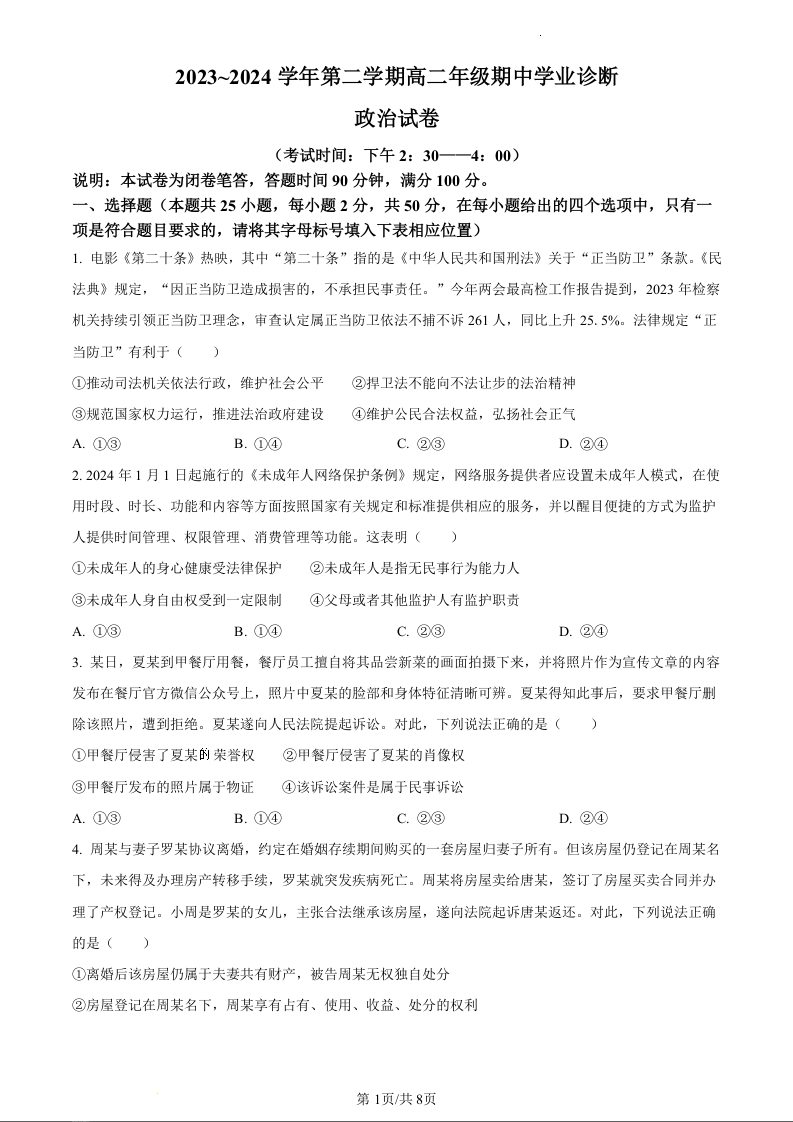 山西省太原市2023-2024学年高二下学期4月期中考试政治(原卷版)