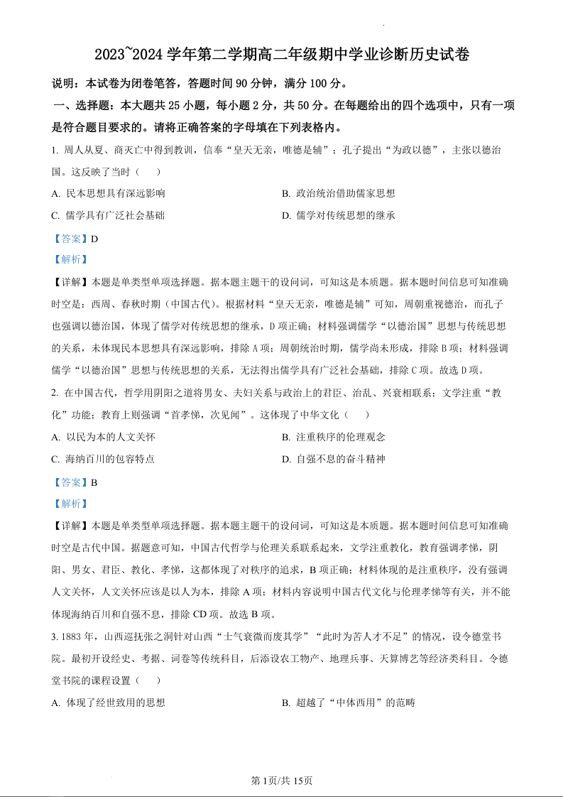 山西省太原市2023-2024学年高二下学期4月期中考试历史(精品解析版)