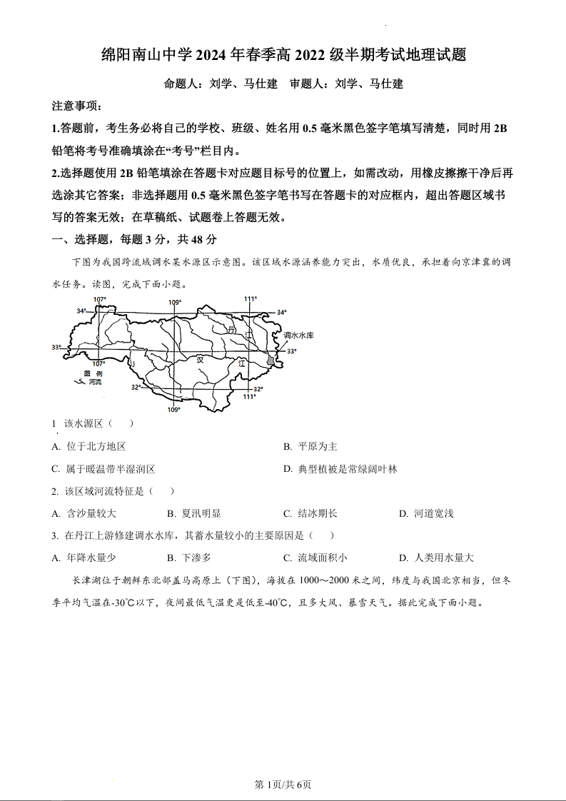 四川省绵阳市南山中学2023-2024学年高二下学期期中考试地理(原卷版)