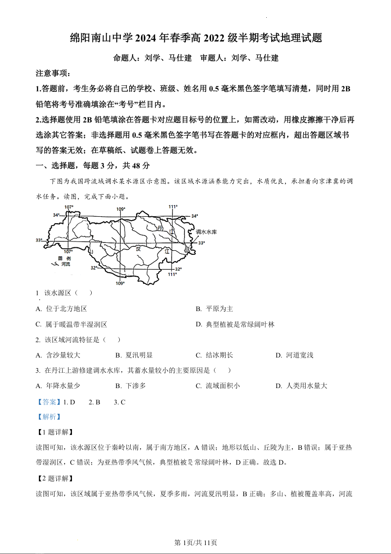 四川省绵阳市南山中学2023-2024学年高二下学期期中考试地理(精品解析版)