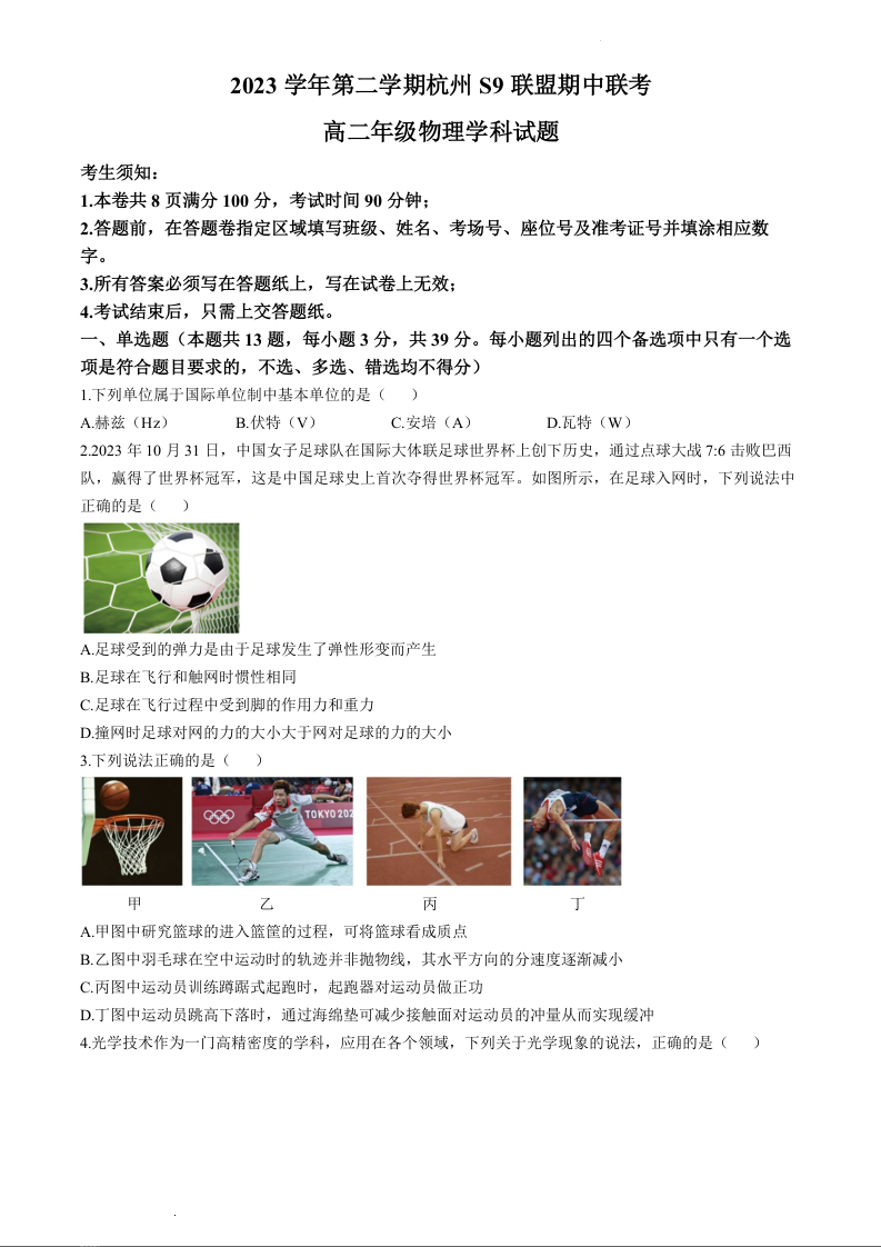 浙江省S9联盟2023-2024学年高二下学期4月期中考试物理+答案