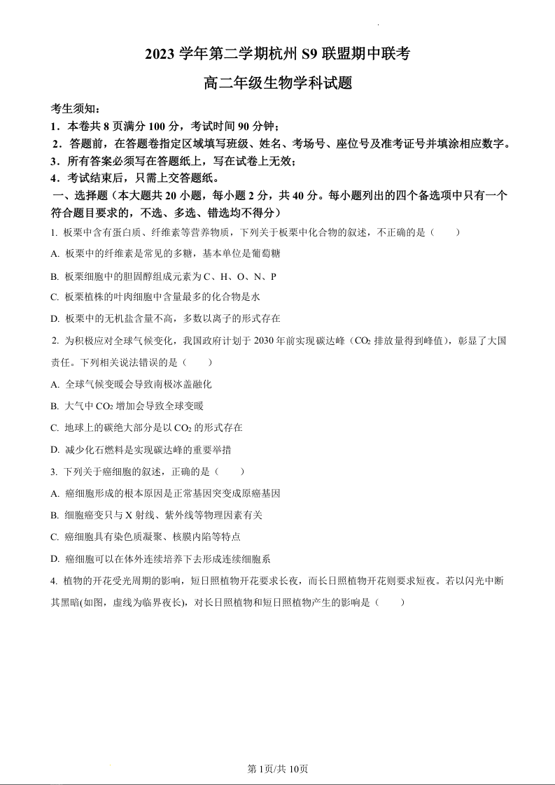 浙江省S9联盟2023-2024学年高二下学期4月期中考试生物(原卷版)