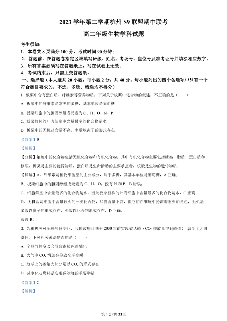 浙江省S9联盟2023-2024学年高二下学期4月期中考试生物(精品解析版)