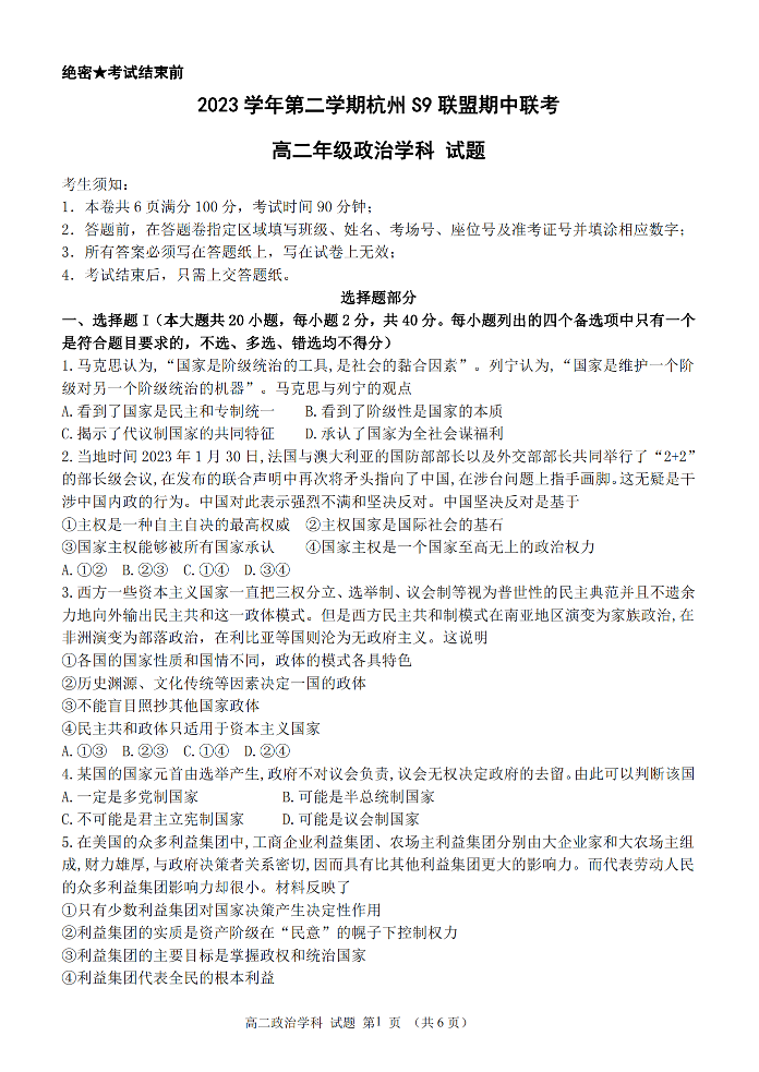 浙江省S9联盟2023-2024学年高二下学期4月期中考试政治