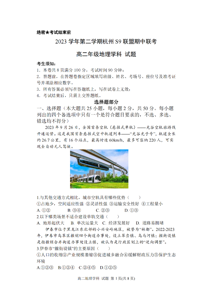 浙江省S9联盟2023-2024学年高二下学期4月期中考试地理