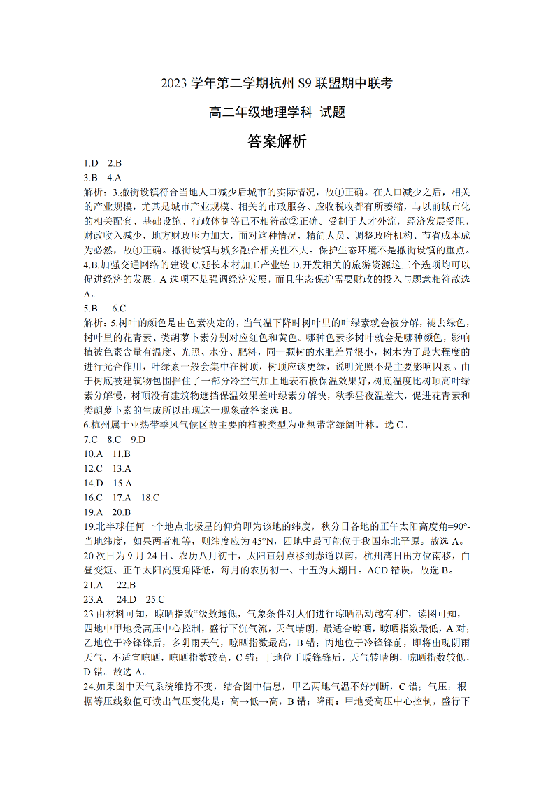 浙江省S9联盟2023-2024学年高二下学期4月期中考试地理答案