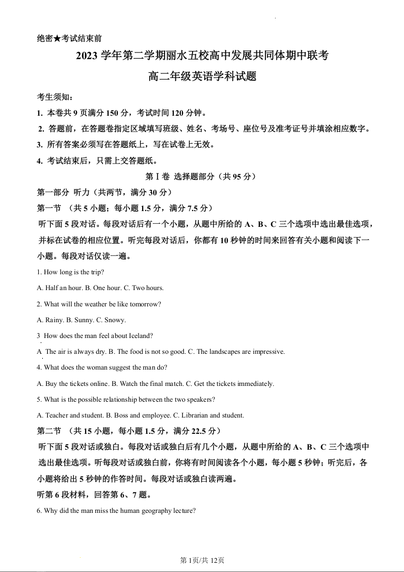 浙江省丽水市发展共同体2023-2024学年高二下学期5月期中联考英语(原卷版)