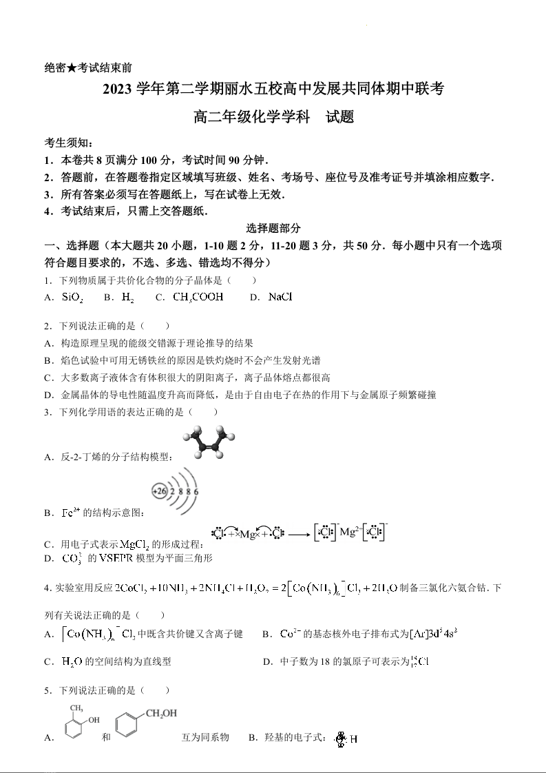 浙江省丽水市发展共同体2023-2024学年高二下学期5月期中联考化学+答案