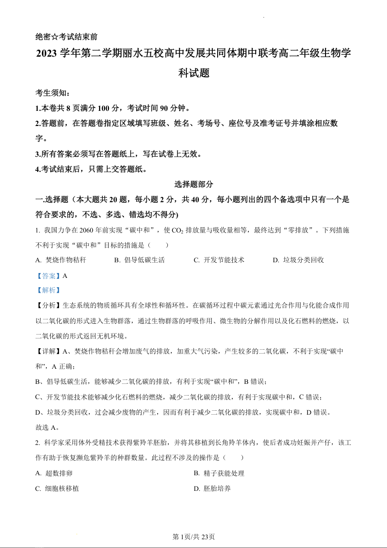 浙江省丽水市发展共同体2023-2024学年高二下学期5月期中联考生物(精品解析版)