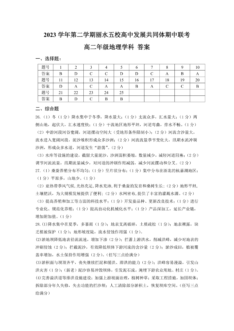 浙江省丽水市发展共同体2023-2024学年高二下学期5月期中联考地理答案