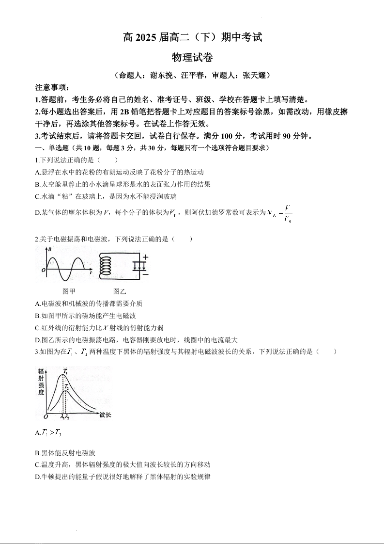 重庆市巴蜀中学校2023-2024学年高二下学期5月期中考试物理
