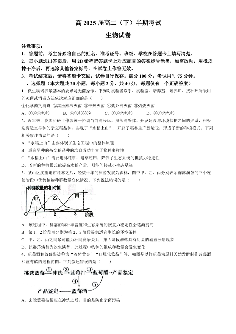 重庆市巴蜀中学校2023-2024学年高二下学期5月期中考试生物+答案