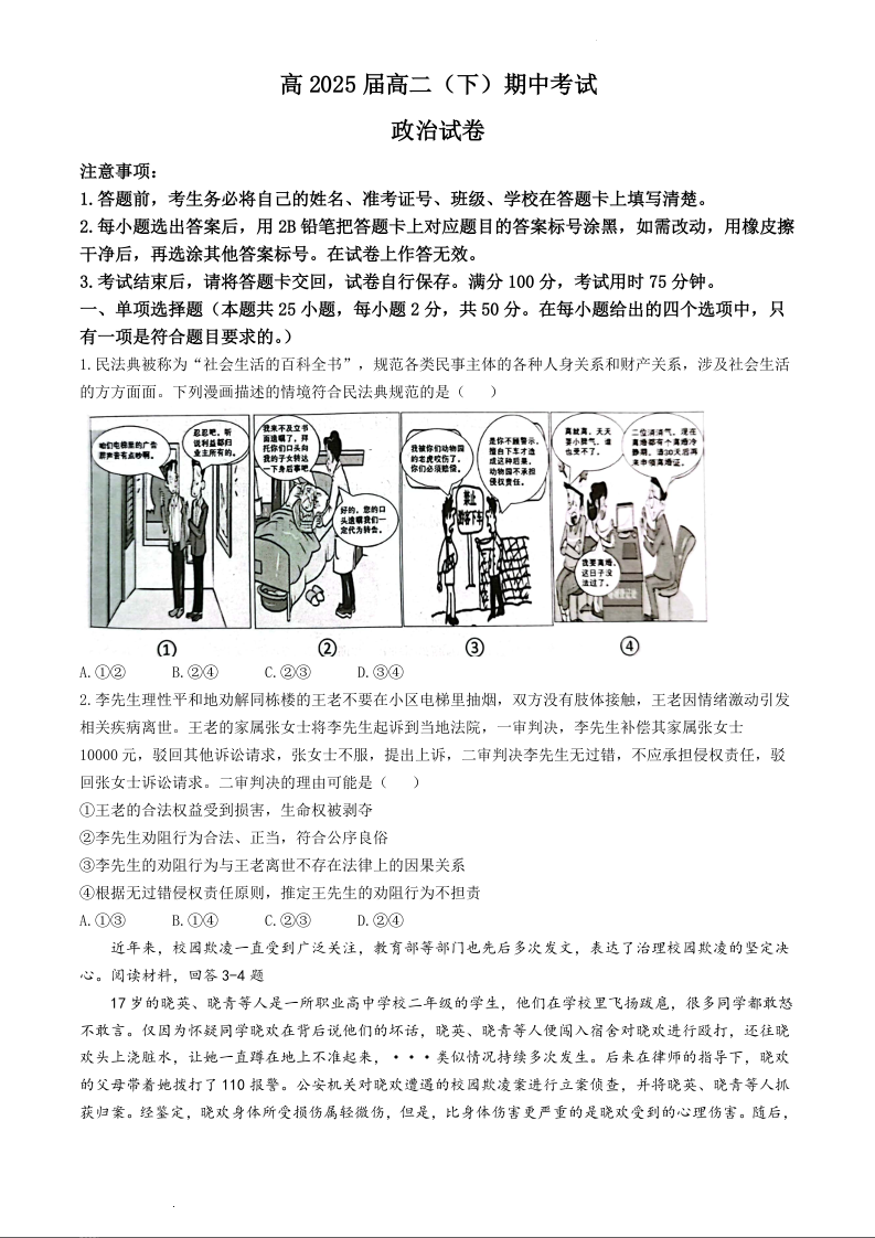 重庆市巴蜀中学校2023-2024学年高二下学期5月期中考试政治