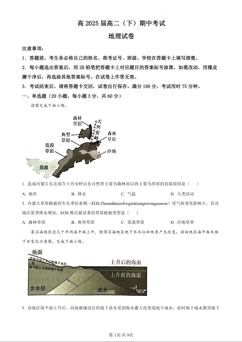 重庆市巴蜀中学校2023-2024学年高二下学期5月期中考试地理(原卷版)