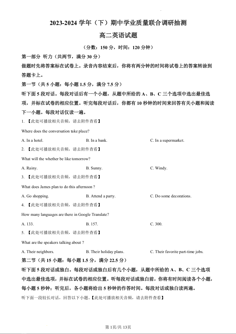 重庆市乌江新高考协作体2023-2024学年高二下学期5月期中考试英语(原卷版)