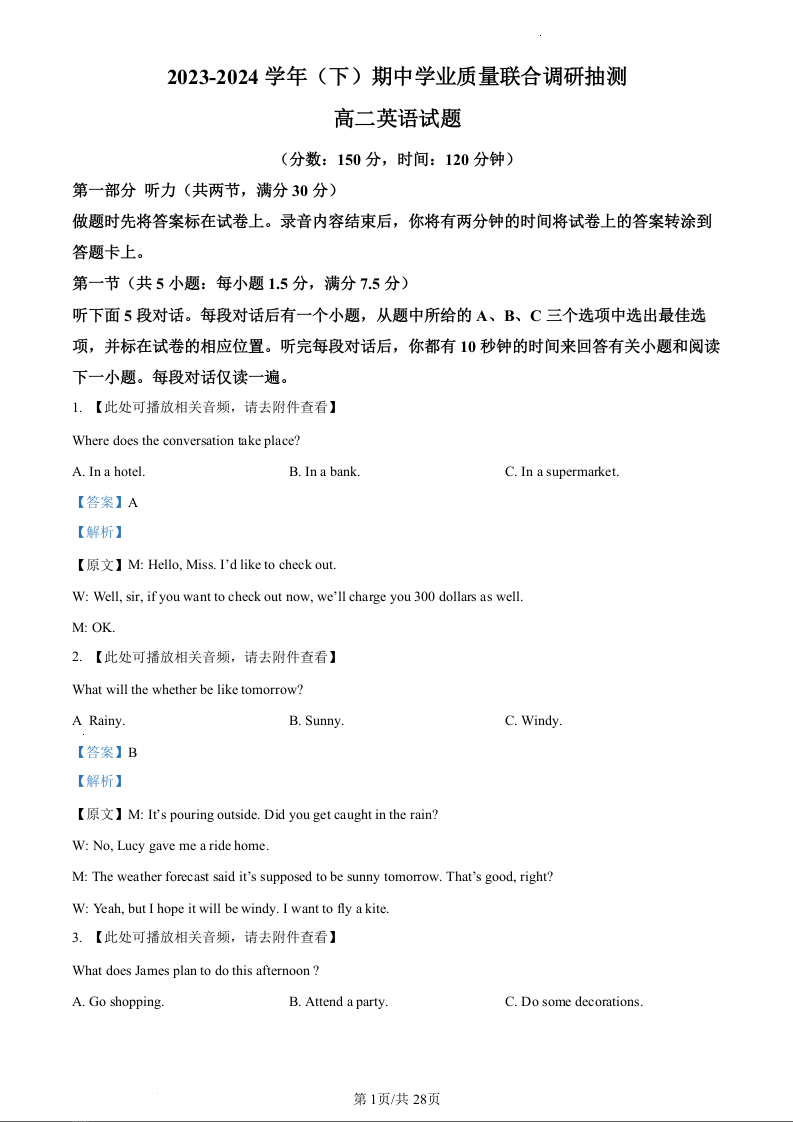 重庆市乌江新高考协作体2023-2024学年高二下学期5月期中考试英语(精品解析版)