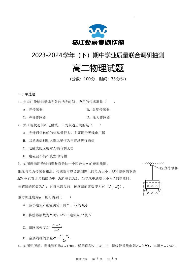 重庆市乌江新高考协作体2023-2024学年高二下学期5月期中考试物理