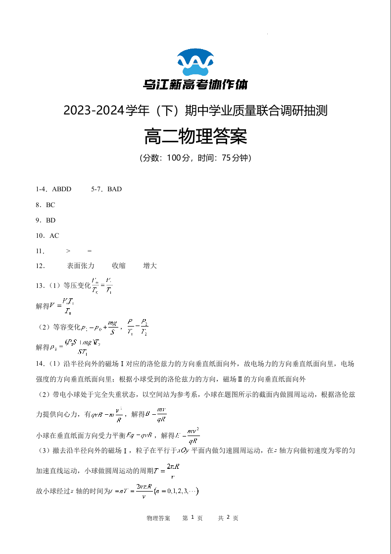 重庆市乌江新高考协作体2023-2024学年高二下学期5月期中考试物理答案