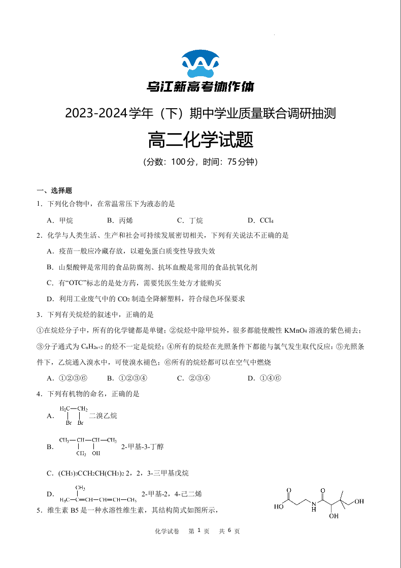 重庆市乌江新高考协作体2023-2024学年高二下学期5月期中考试化学