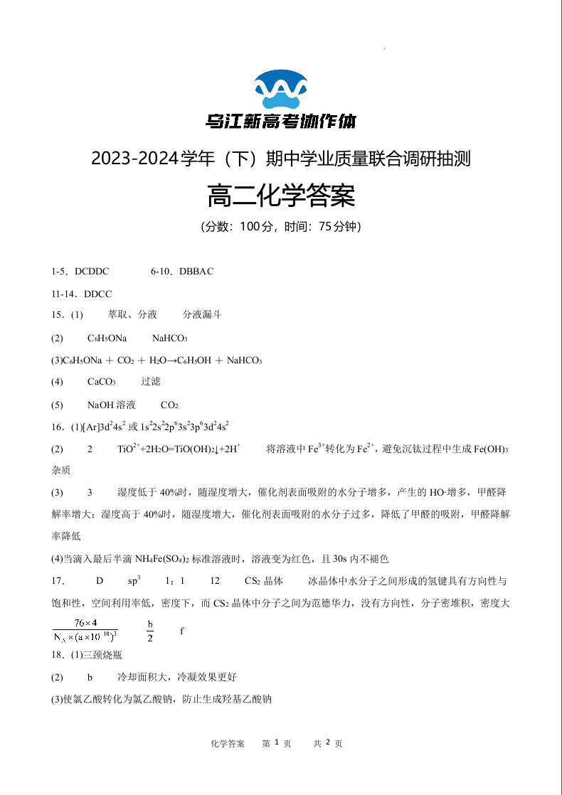 重庆市乌江新高考协作体2023-2024学年高二下学期5月期中考试化学答案