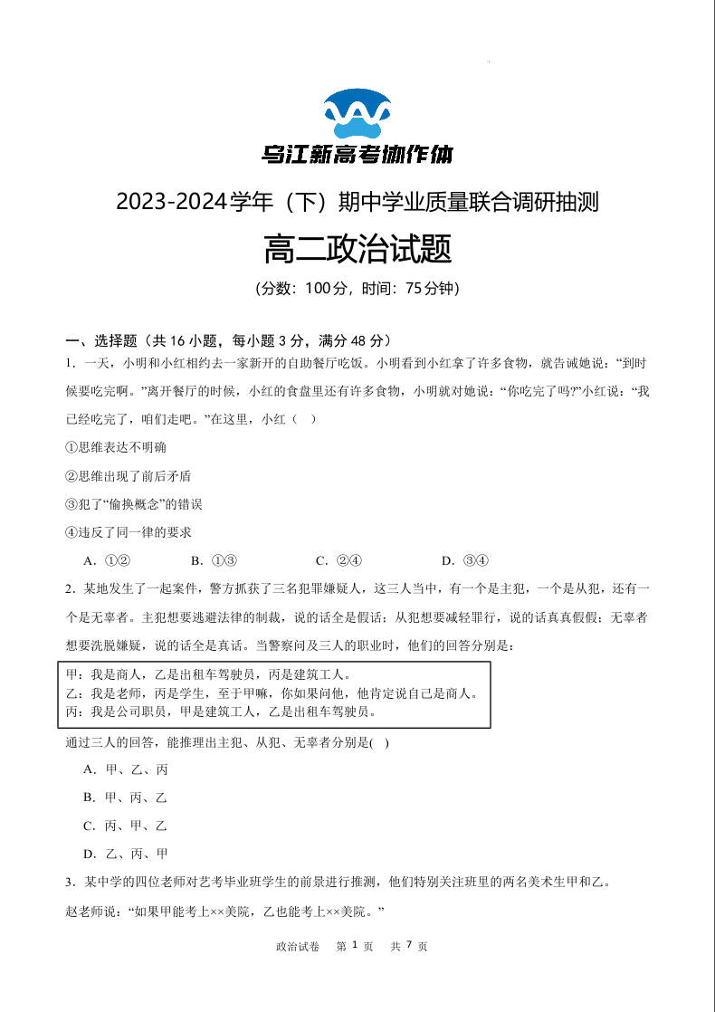 重庆市乌江新高考协作体2023-2024学年高二下学期5月期中考试政治