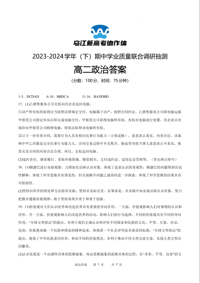重庆市乌江新高考协作体2023-2024学年高二下学期5月期中考试政治答案