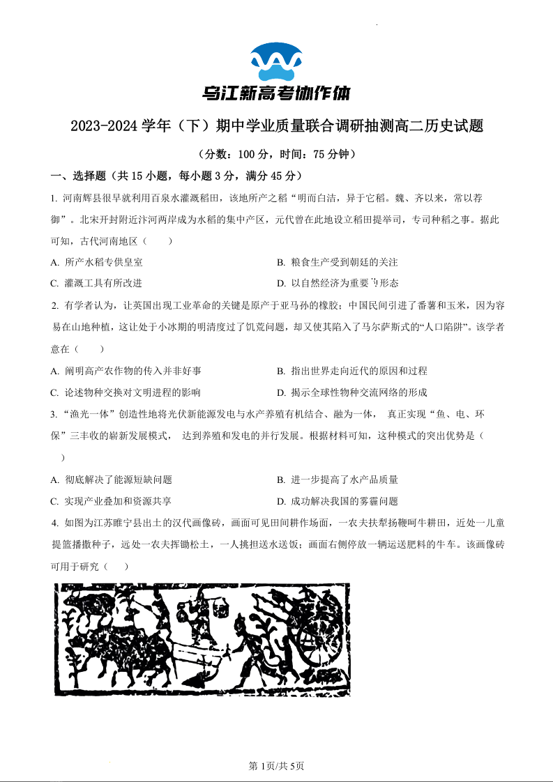 重庆市乌江新高考协作体2023-2024学年高二下学期5月期中考试历史(原卷版)