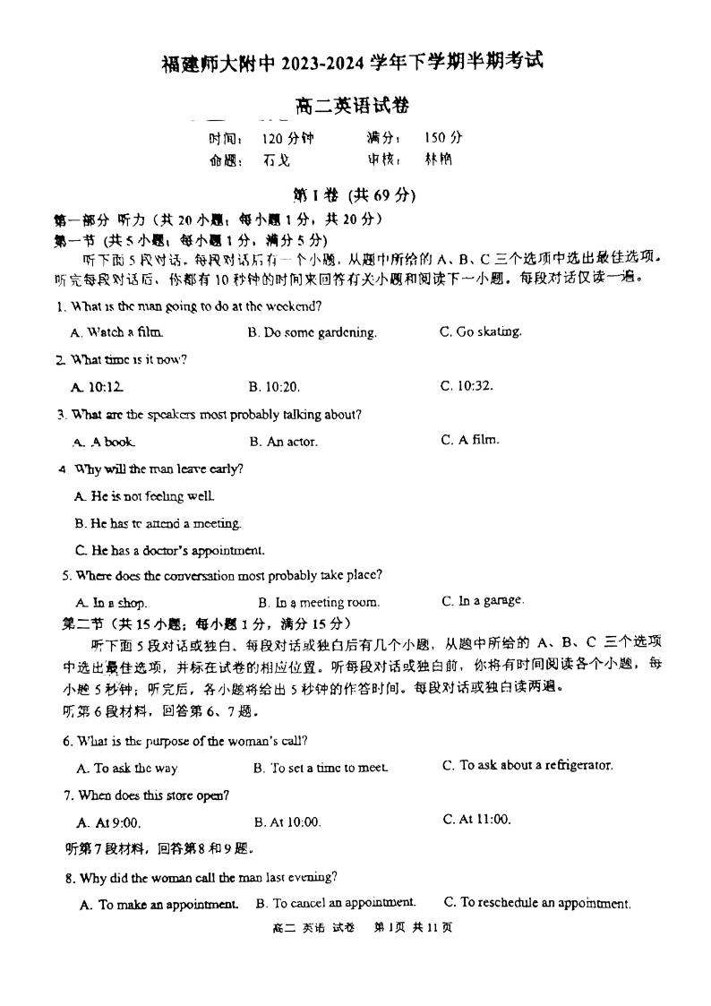 福建省师范大学附属中学2023-2024学年高二下学期期中考试英语+答案