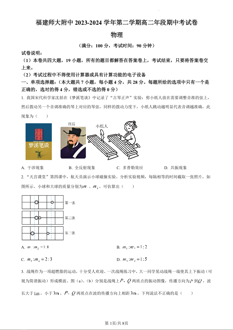 福建省师范大学附属中学2023-2024学年高二下学期期中考试物理(原卷版)