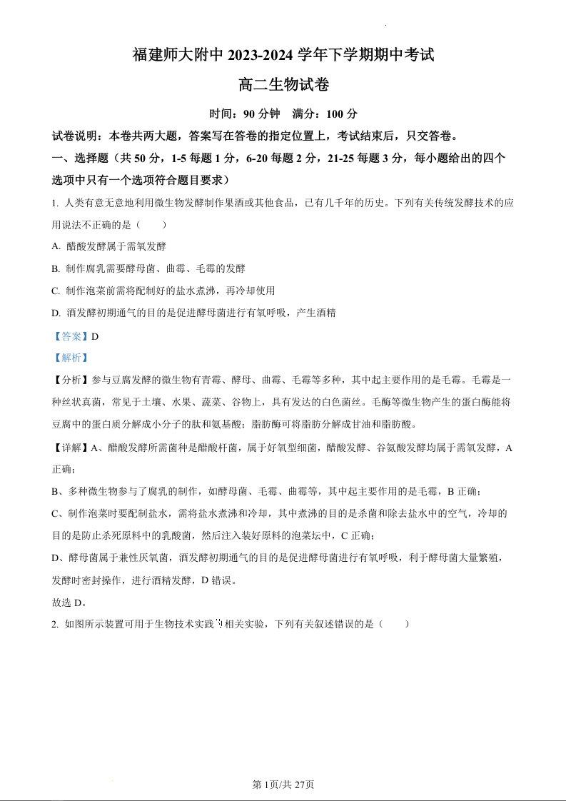 福建省师范大学附属中学2023-2024学年高二下学期期中考试生物(精品解析版)