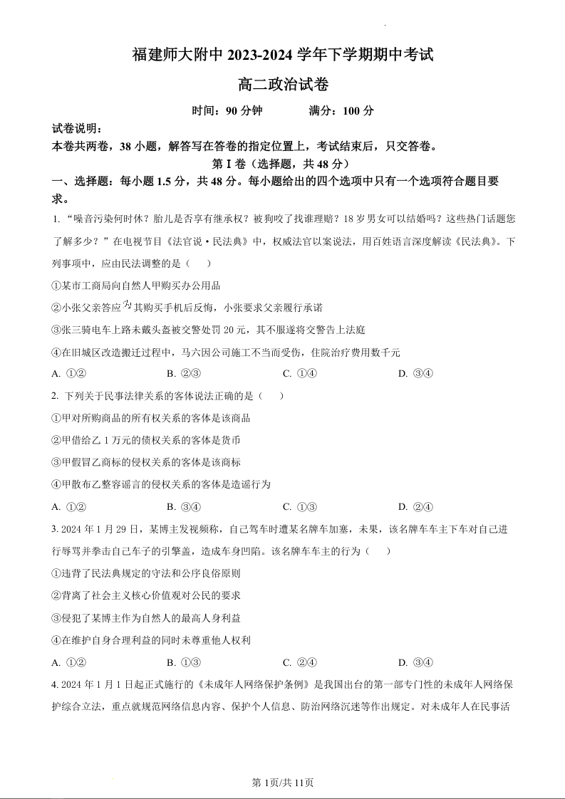 福建省师范大学附属中学2023-2024学年高二下学期期中考试政治(原卷版)