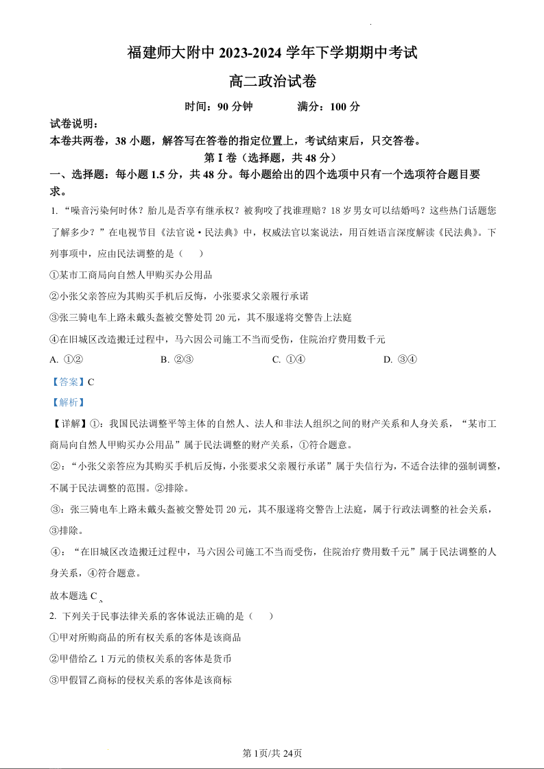 福建省师范大学附属中学2023-2024学年高二下学期期中考试政治(精品解析版)