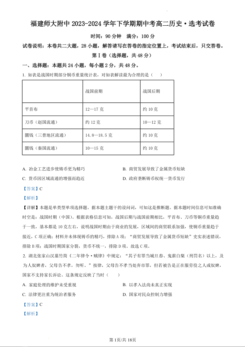 福建省师范大学附属中学2023-2024学年高二下学期期中考试历史(精品解析版)