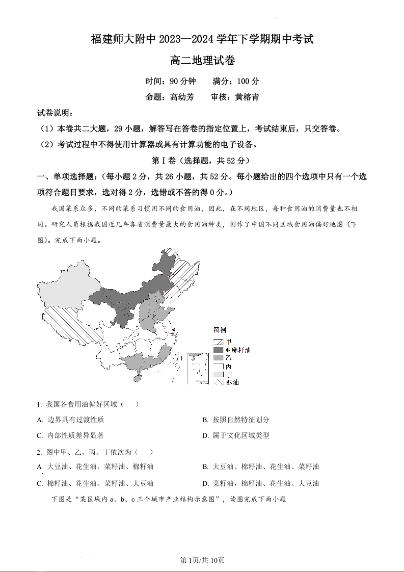 福建省师范大学附属中学2023-2024学年高二下学期期中考试地理(原卷版)