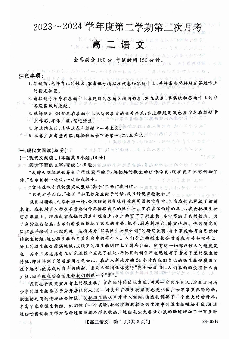 甘肃省武威市2023-2024学年高二下学期6月月考语文+答案