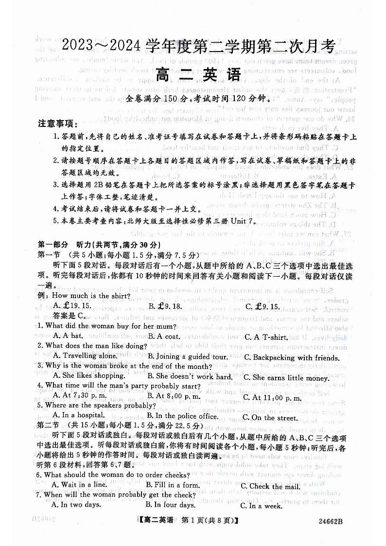 甘肃省武威市2023-2024学年高二下学期6月月考英语+答案