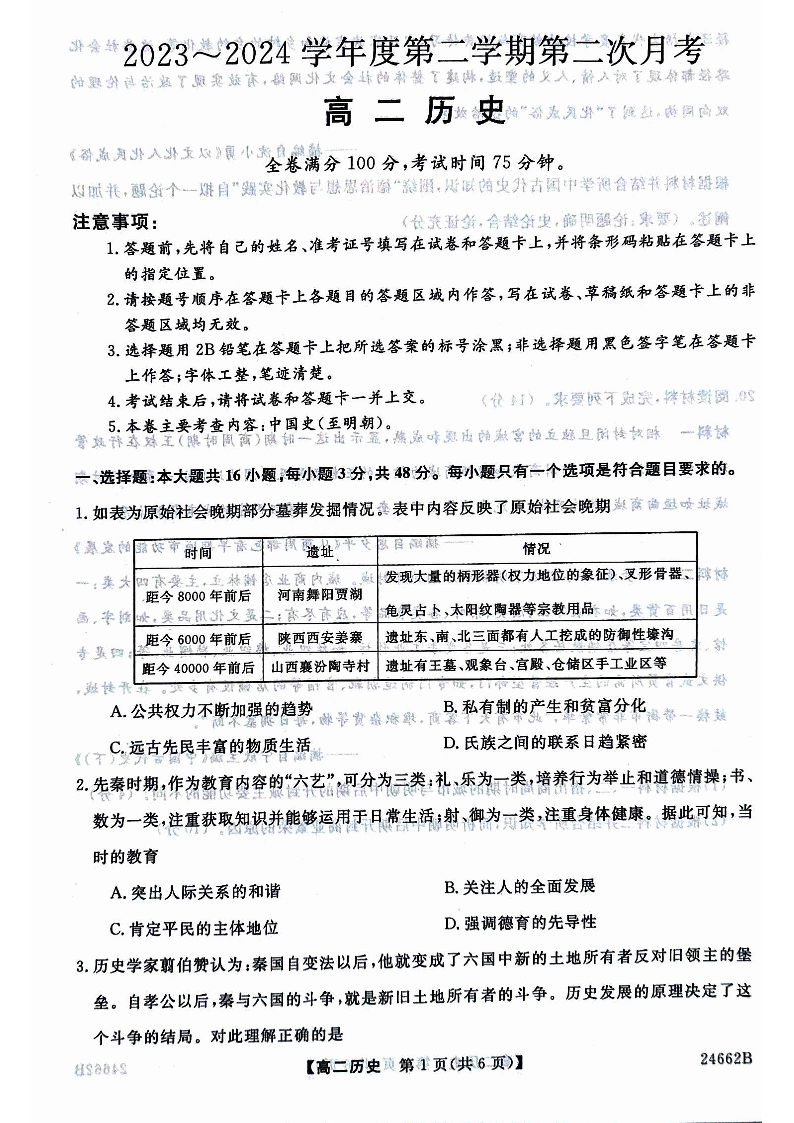甘肃省武威市2023-2024学年高二下学期6月月考历史+答案
