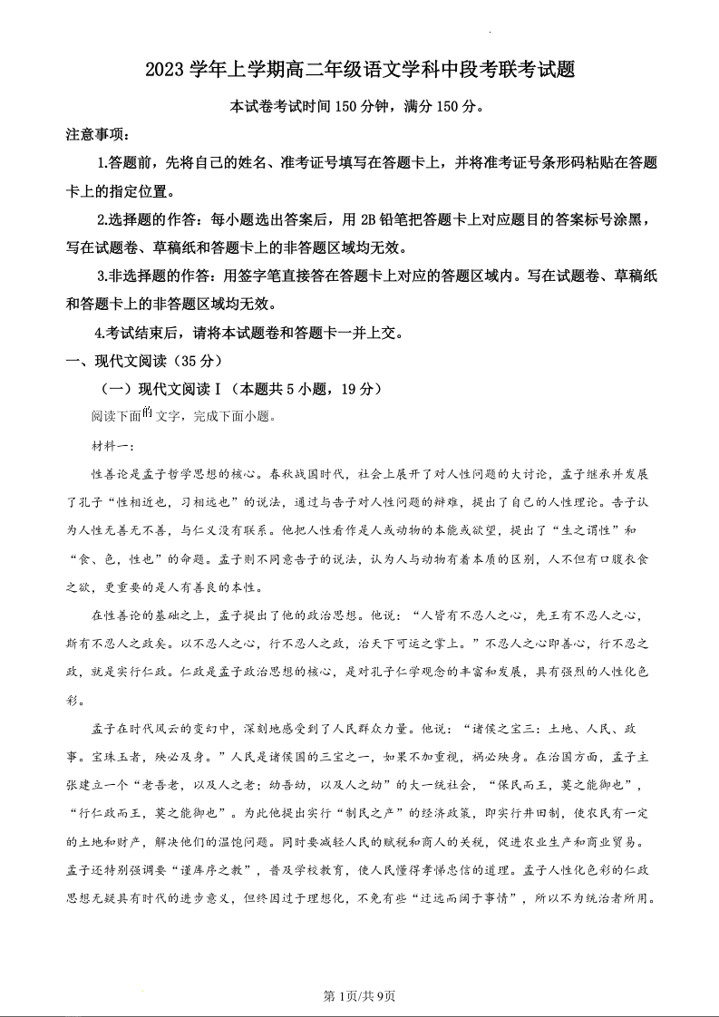 广东省广州市七校2023-2024学年高二上学期期中联考语文(原卷版)