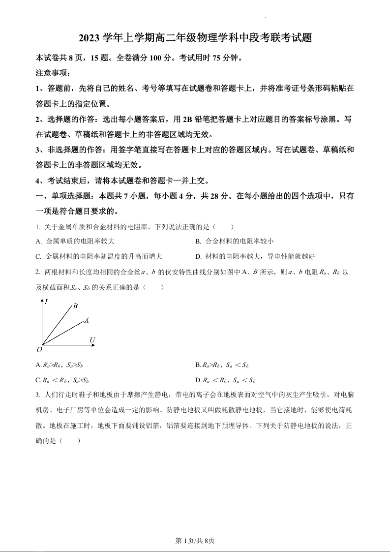广东省广州市七校2023-2024学年高二上学期期中联考物理(原卷版)