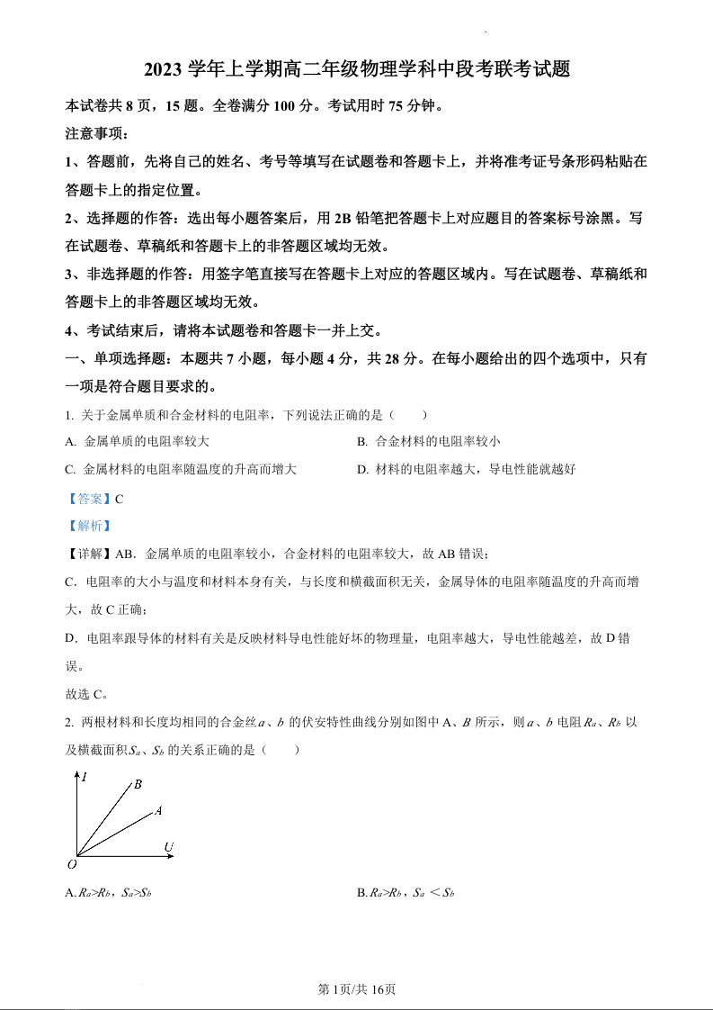 广东省广州市七校2023-2024学年高二上学期期中联考物理(精品解析版)