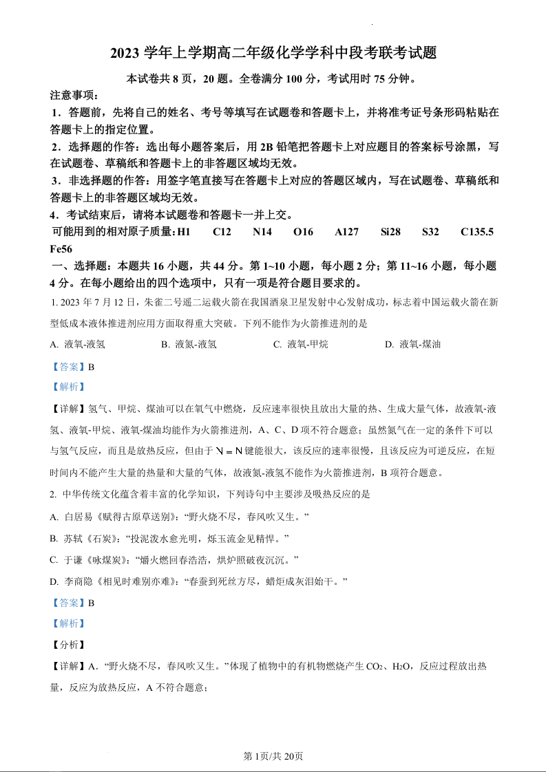 广东省广州市七校2023-2024学年高二上学期期中联考化学(精品解析版)