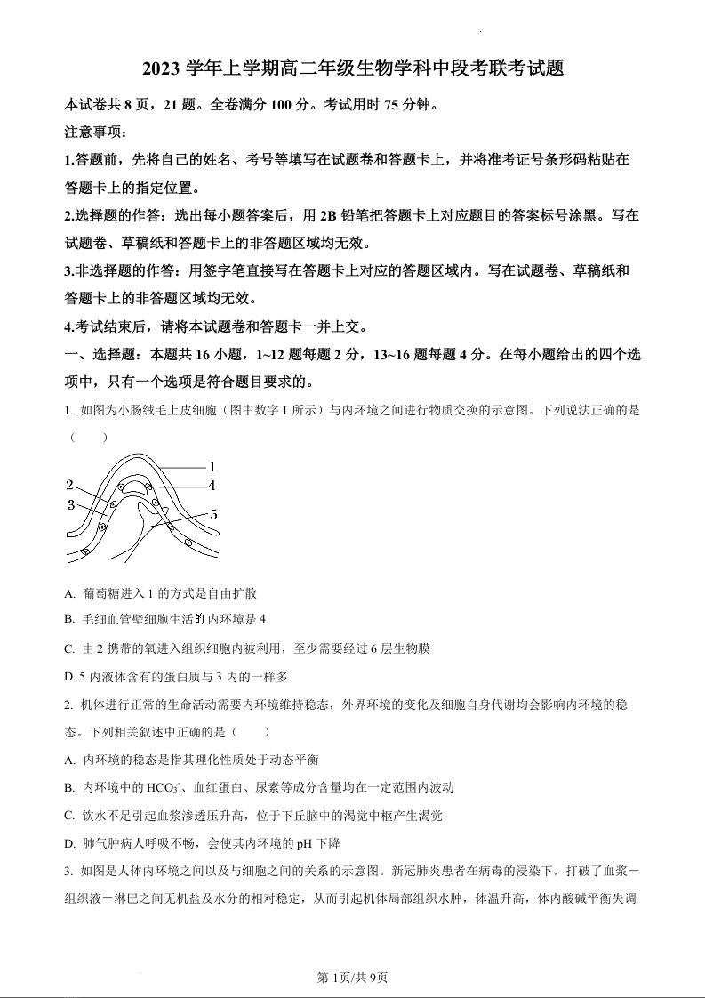 广东省广州市七校2023-2024学年高二上学期期中联考生物(原卷版)