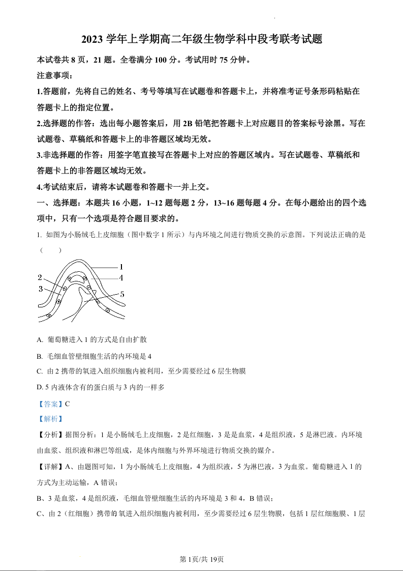 广东省广州市七校2023-2024学年高二上学期期中联考生物(精品解析版)
