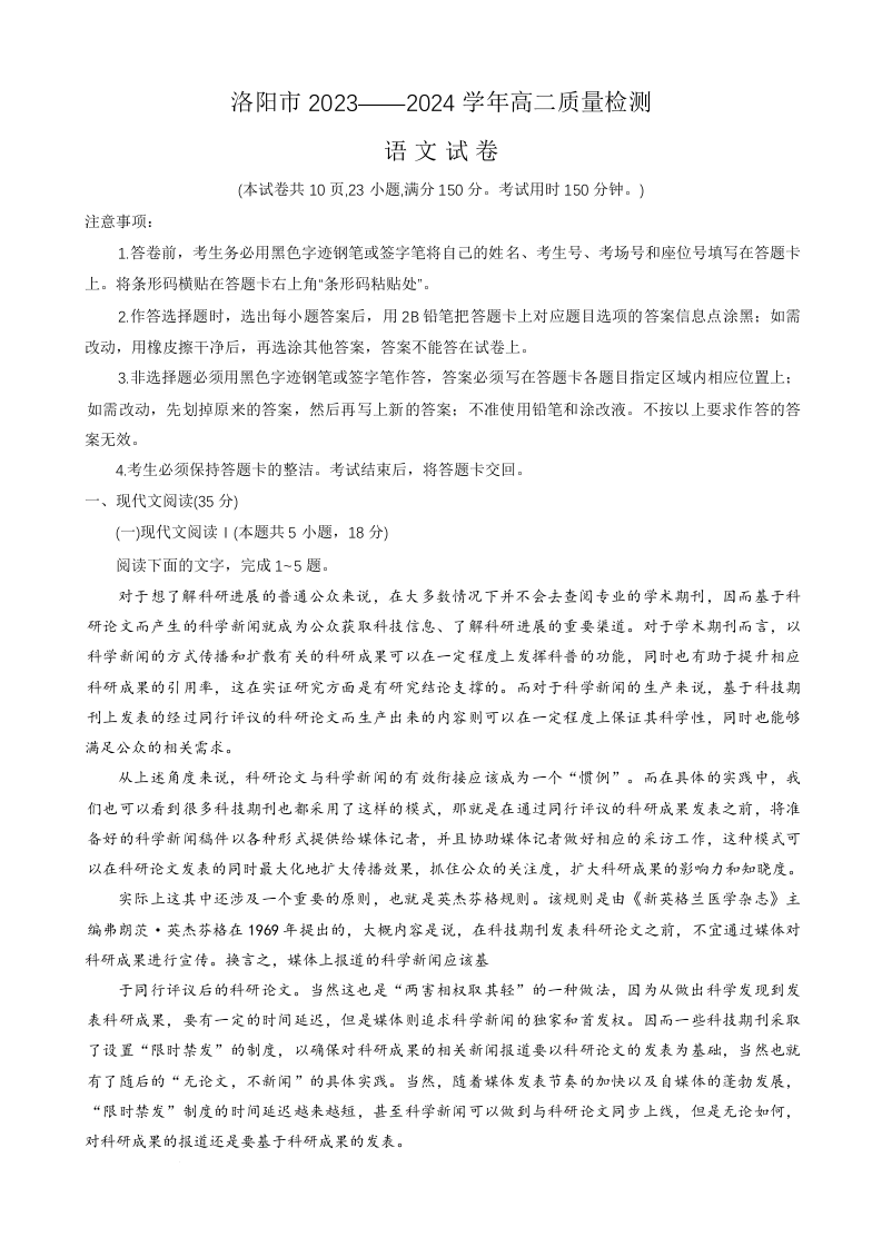 河南省洛阳市2023-2024学年高二下期期末考试语文