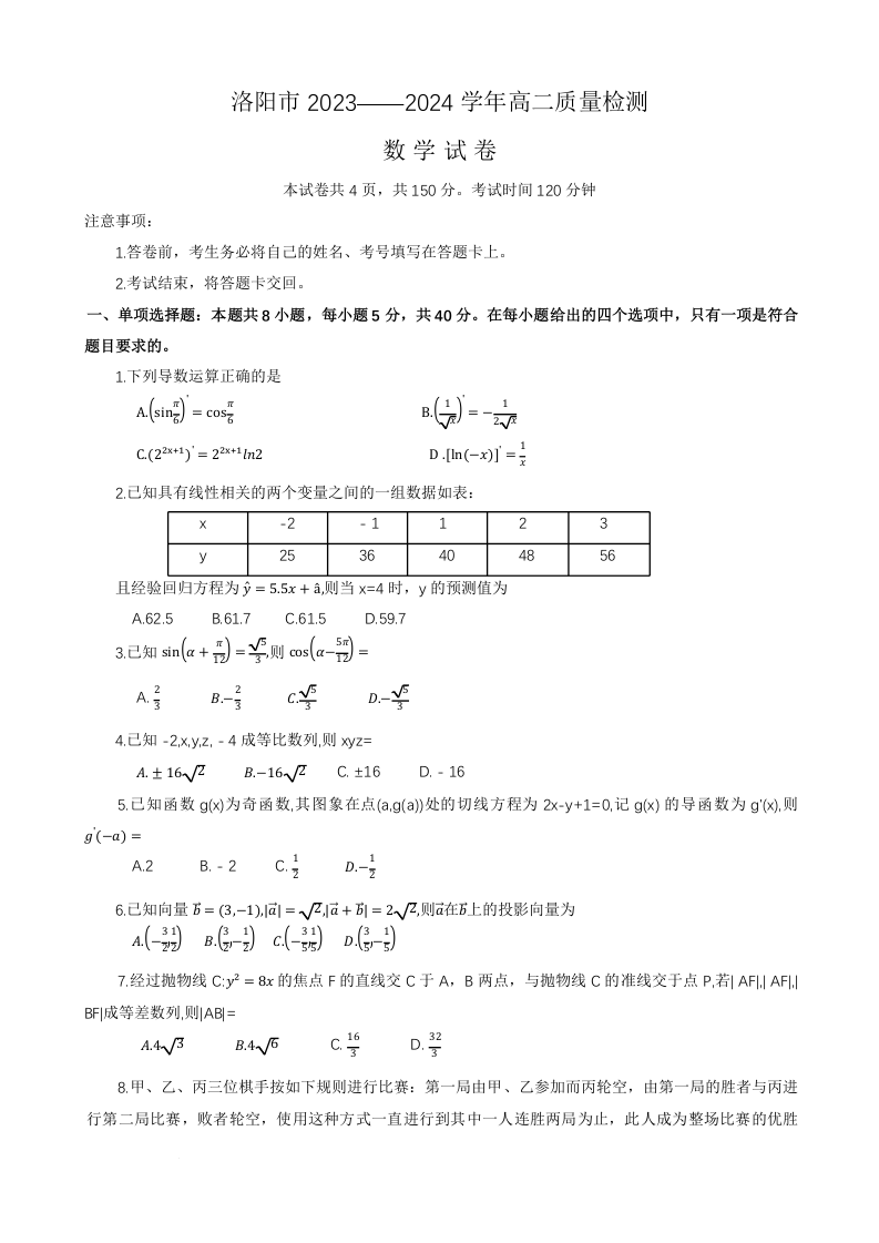 河南省洛阳市2023-2024学年高二下期期末考试数学+答案