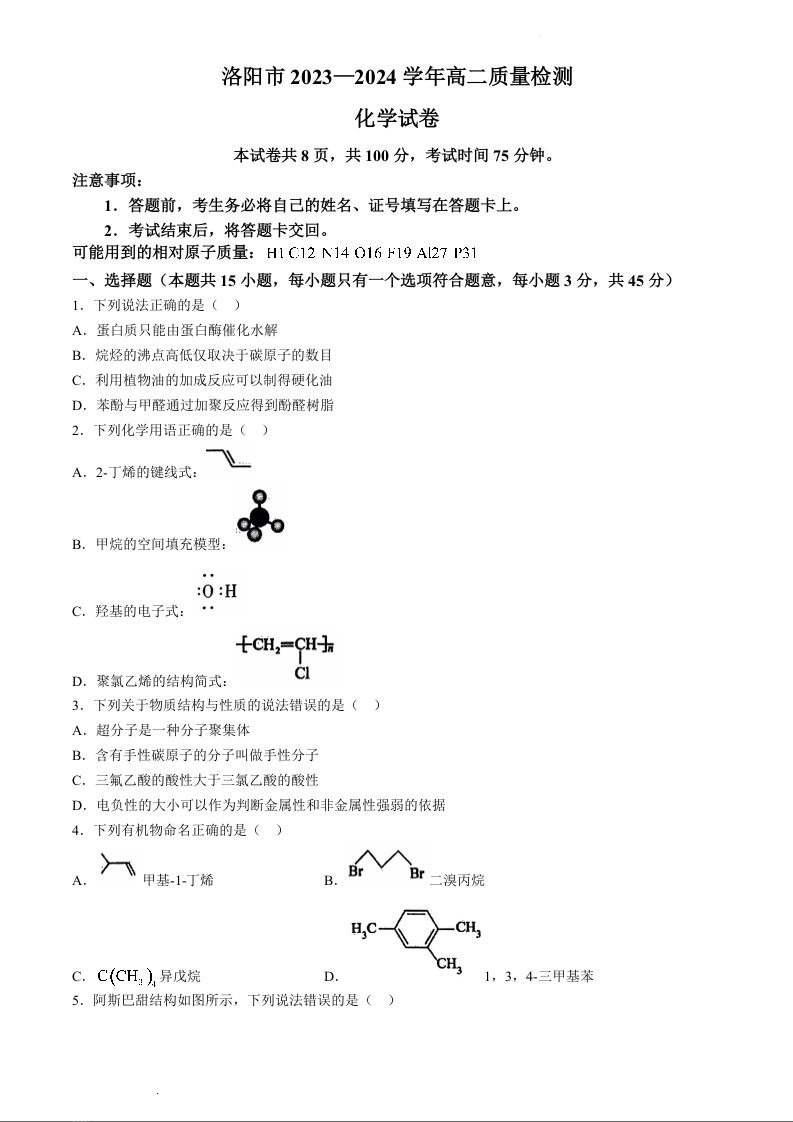 河南省洛阳市2023-2024学年高二下期期末考试化学